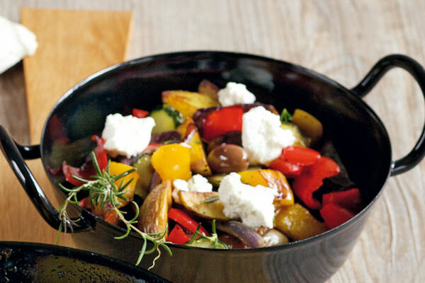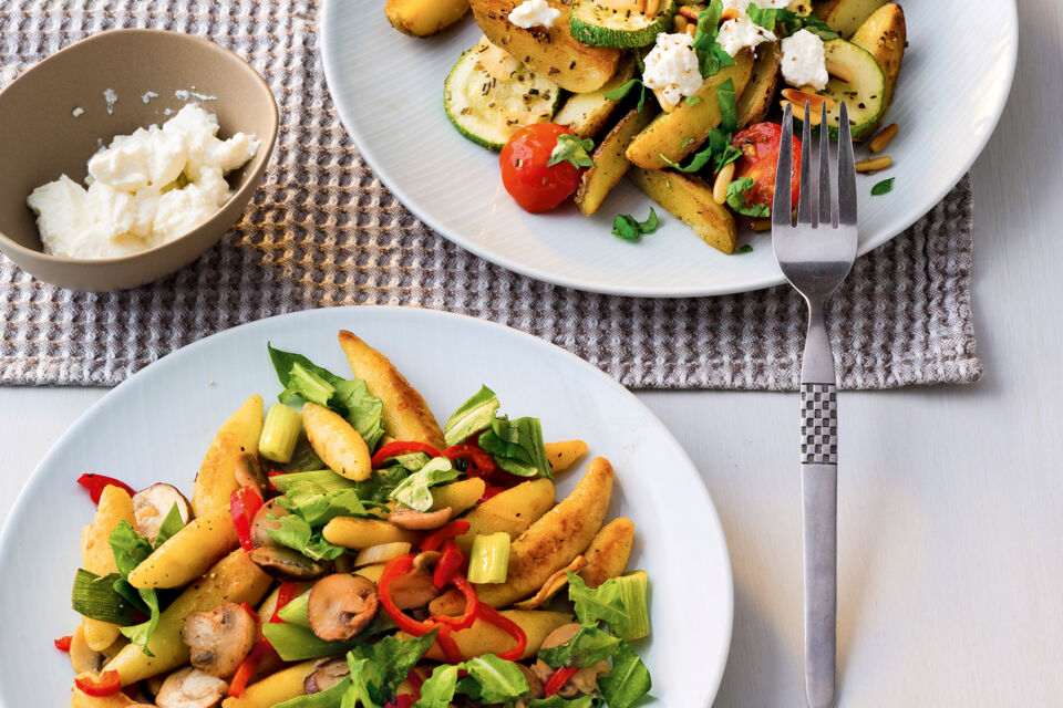 Die Kartoffeln mit der Hlfte der Marinade vermengen und bei 170 bis 180 Grad fr 20 Minuten in einer Auflaufform in den Backofen geben die restliche Marinade mit dem Gemse vermengen. Die mediterrane Kartoffel-Gemse-Pfanne ist ein wohlschmeckendes vegetarisches Gericht das auch als Beilage etwa zu Fisch- und Fleischgerichten usw. l in einer groen Pfanne erhitzen.